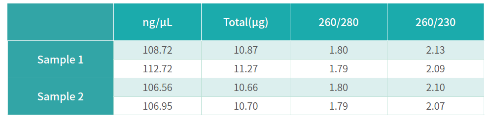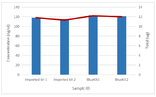 Extract genomic DNA from two blood samples respectively with the imported kit and the Bluekit® kit, and then detect the concentration with Nanodrop.